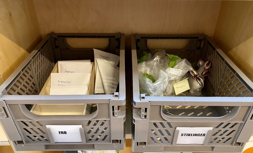 Reolen bor på venstre side af trappen, når du ankommer fra hovedindgangen. Kom og vær med til at dele dine grønne godter, tøj og legeredskaber fra gemmerne samt materialer til nye kreative projekter! Når vi deler forbinder vi os med hinanden og vores ting får nyt liv.